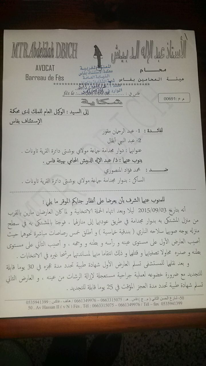 عاش سكان جماعة مولاي بوشتى بتاونات، على واقعة إطلاق خمس رصاصات من بندقية صيد، في ملك ابن رئيس الجماعة سابقا و عضو الغرفة الفلاحية لجهة فاس مكناس عن حزب التجمع الوطني للأحرار، على منافسي أبيه في الانتخابات الجماعية، لكن لحد الآن لم تقم النيابة العامة باستدعاء المتهم الرئيسي، رغم أن هذه الرصاصات خلفت مصابين أحدهما حالته جد خطيرة و مهدد بعاهة مستديمة، بسبب إصابته في عينه اليسرى، علما أنه قام بعمليتين جراحيتين و لم تنجح أي منهما، كما أنه حصل على شهادة طبية مدة العجز فيها 60 يوما قابلة لتمديد من طرف المستشفى الجامعي الحسن الثاني بفاس، و مصاب أخر أصيب في بطنه، و رغم كل هذا إلا أن النيابة العامة لم تقم باستدعائه ،و الخطير في الأمر أن الواقعة وقعت ليلة الخميس و صباح الجمعة، أي في مرحلة جد حساسة و هي الانتخابات الجماعية .