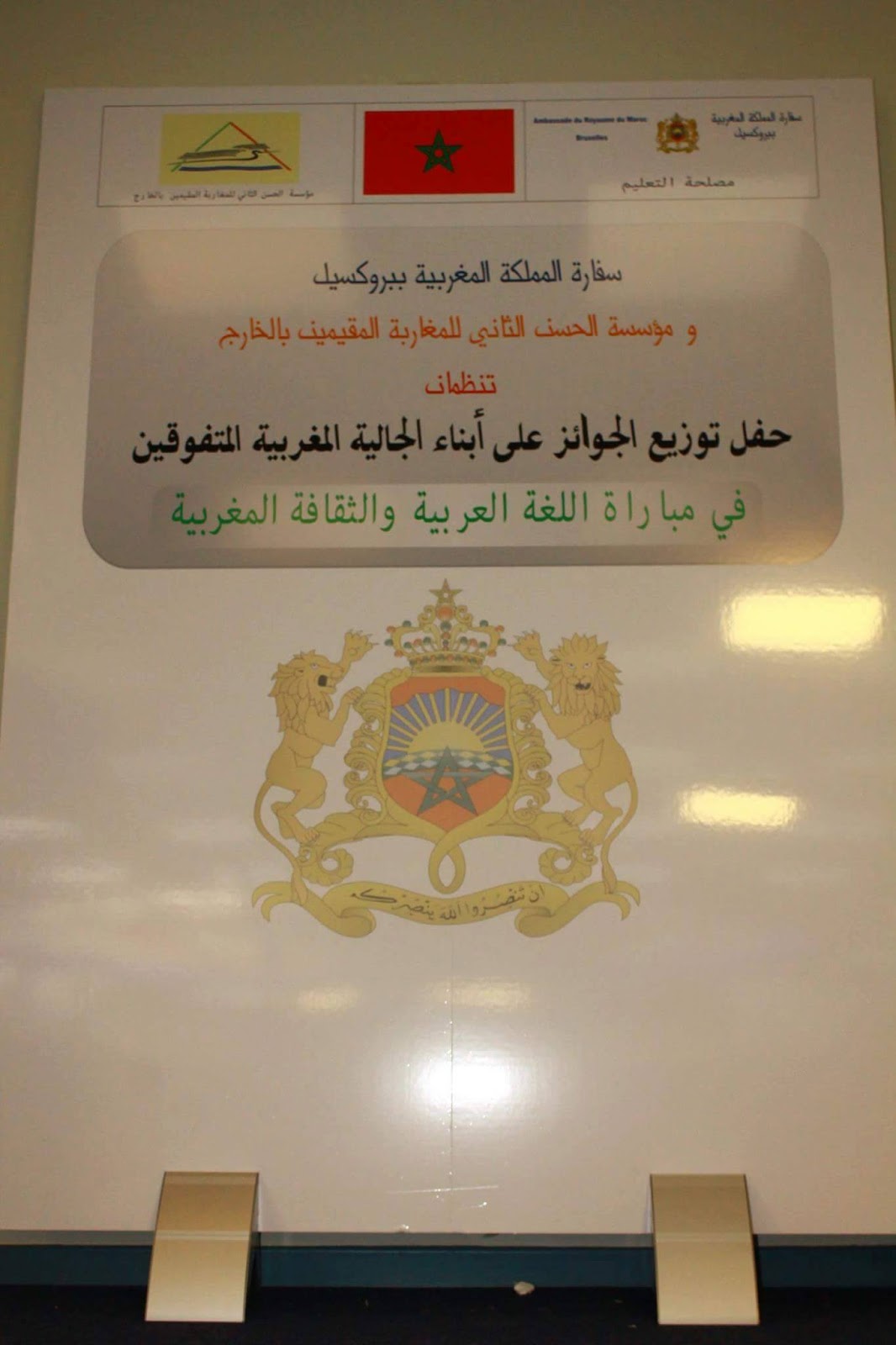 ببروكسيل على تنظيم الحفل السنوي الخاص بتوزيع الجوائز على المتعلمين المتوفقين في مباراة نيل شهادة استكمال الدروس الابتدائية في اللغة العربية و الثقافة المغربية ﻷبناء الجالية المغربية ببلجيكا. وذلك بمقر القنصلية العامة للمملكة المغربية ببروكسيل .و تجدر الإشارة إلى أن مؤسسة الحسن الثاني للمغاربة المقيمين بالخارج باعتبارها المشرف على تعليم اللغة العربية و الثقافة المغربية ﻷبناء الجالية المغربية تولي اهتماما بالغا لهذه التظاهرة لما لها من وقع على تجويد تعليم اللغة العربية بالمهجر. و قد عرفت المباراة إقبالا كبيرا بحيث تقدم لاجتيازها مئات من أبناء الجالية ببلجيكا سيما بعد التطور الذي شهدته هذه المباراة شكلا و تنظيما خلال السنوات اﻷخيرة. ويتم اختبار المترشحين في مواد أساسية مرتبطة بترسيخ الهوية الوطنية و العقائدية للمغرب و المتميزة بالانفتاح و التعايش و نبذ أفكار الحقد و التطرف و الكراهية من ضمنها تاريخ المغرب و جغرافيته... و يتخلل الحفل فقرات فنية مسرحية و غنائية مغربية يقدمها أبناء الجالية تحت إشراف أساتذة البعثة التعليمية المغربية ببلجيكا.وحضر هذا الحفل كل من نائب سفير صاحب الجلالة والقناصلة العامون للمملكة المغربية بكل من بروكسل ولييج وانفرس بالإضافة إلى بعض المنتخبين ومدراء الأبناك الوطنية المغربية ببلجيكا ورؤساء الجمعيات والمراكز اللتي تعنى بتدريس اللغة العربية والثقافة المغربية لأبناء الجالية والمئات من آباء وأولياء المتعلمين المحتفى بهم .