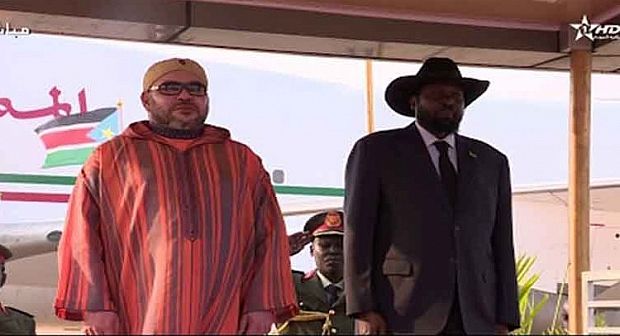 ولدى نزول جلالة الملك من الطائرة بمطار جوبا الدولي، وجد في استقباله رئيس جمهورية
