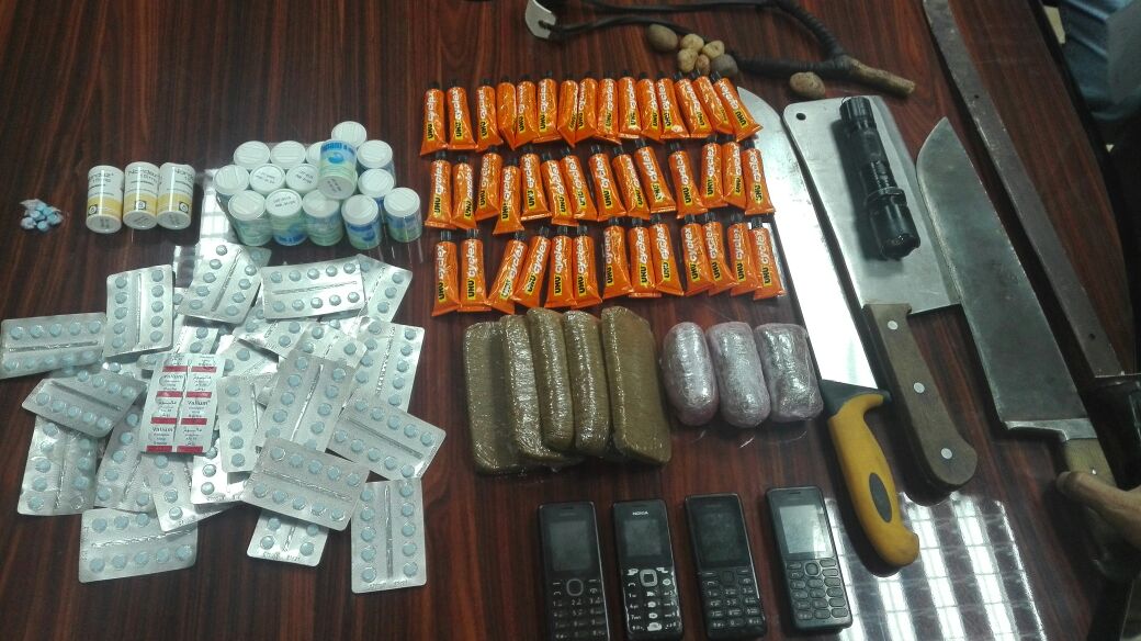 أسلحة بيضاء من مختلف الأحجام من بينها سيف طوله 45 سنتيم، 1 كيلوغرام من مخدر الشيرا، على مستوى رجله بعيار ناري.