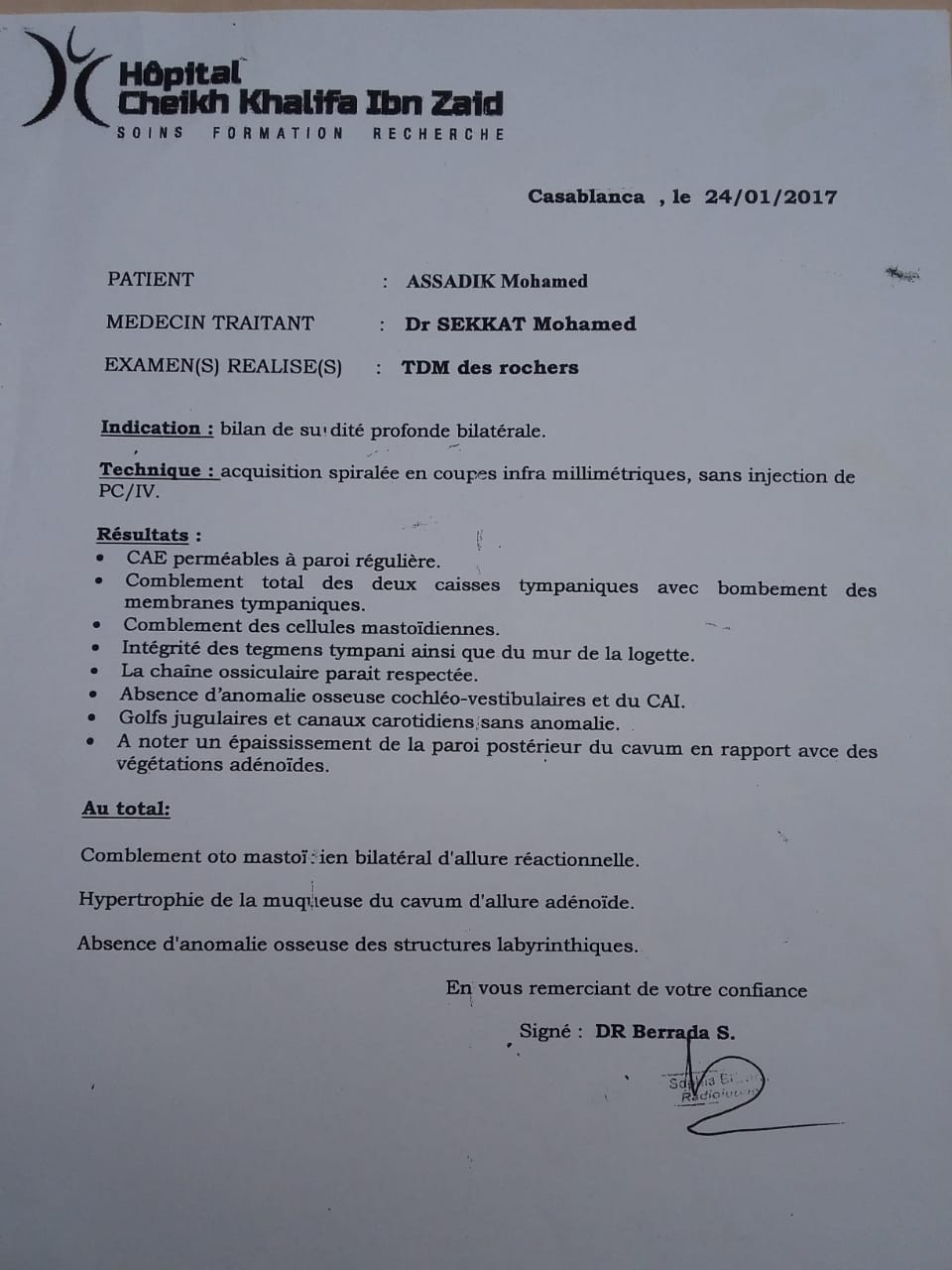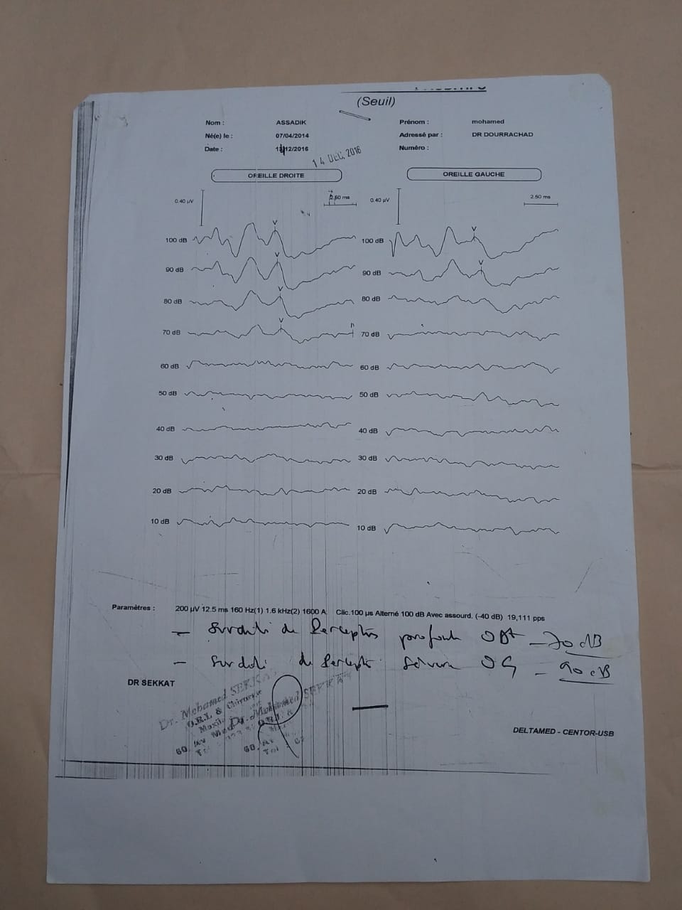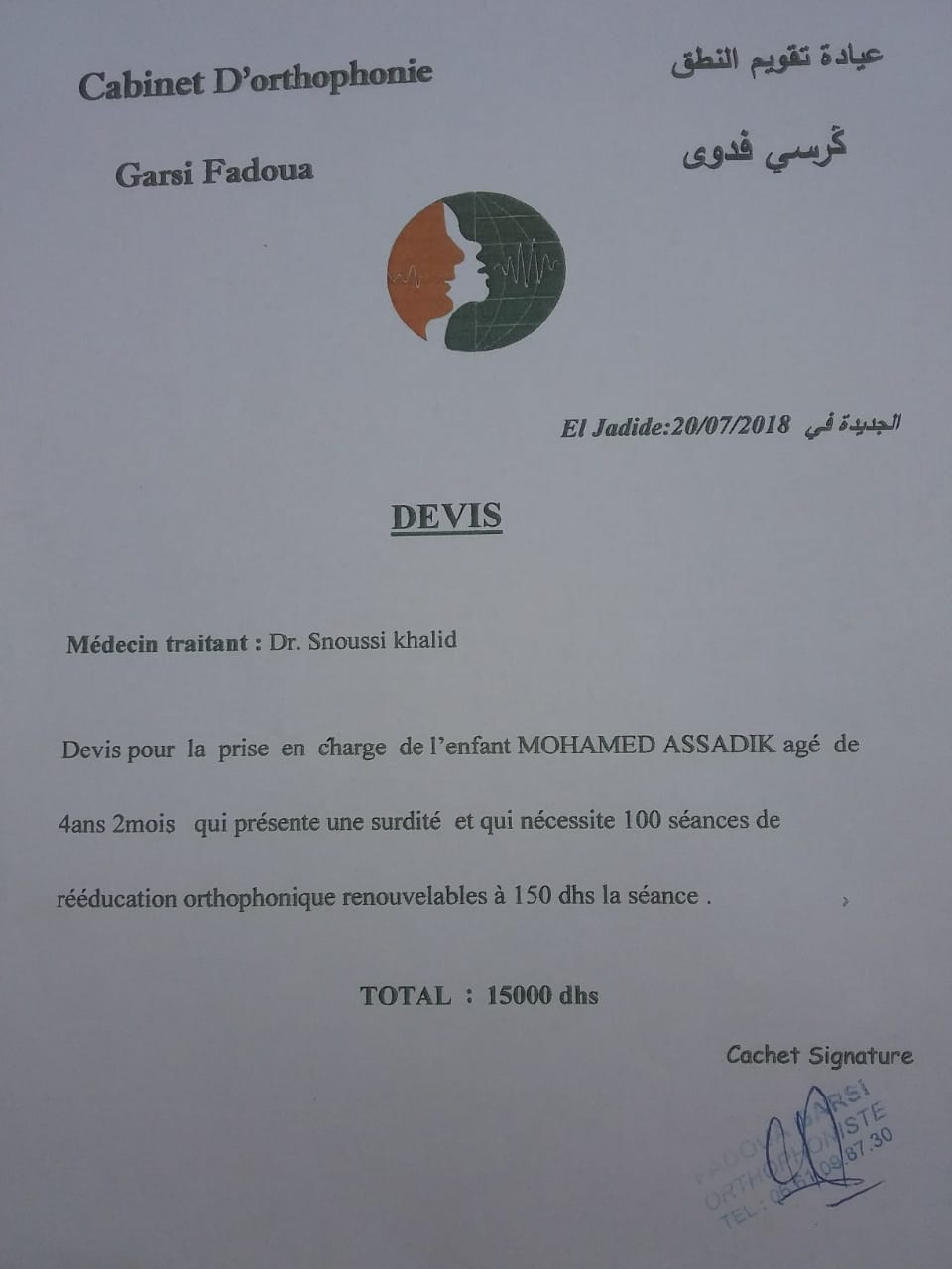 اناشدكم اخوتي المحسنين خارج المغرب وداخله بتقديم مساعدة مالية الى السيد الصادق عيسى الساكن بدوارالحراطة جماعة وقيادة اولاد رحمون عمالة الجديدة. معيل لأسرة تتكون من 12 فردا بدخل شهرى لا يتعدى 1300 درهم. بمساهمات من عمله وأفراد عائلته وبعض المحسنين، تمكن من اجراء عملية جراحية لزرع القوقعة لابنه محمد كونه ولد اصم وأبكم، كللت بالنجاح وحصل على الة سمع الكترونية بكلفة 25 مليون سنتيم من مستشفى الشيخ خليفة بالدار البيضاء. وللحفاظ عليها فهو مطالب بمراقبتها باستمرار لدى الشركة المختصة بالدار البيضاء مع تزويدها بقطع غيار باهظة التمن على الدوام، كما تتطلب هده الالة من المستفيد منها في السنين الاولى بضرورية الاستعانة بأخصائي للترويض لإجراء اربعة حصص اسبوعيا لمدة ثلاثة سنوات تقريبا.