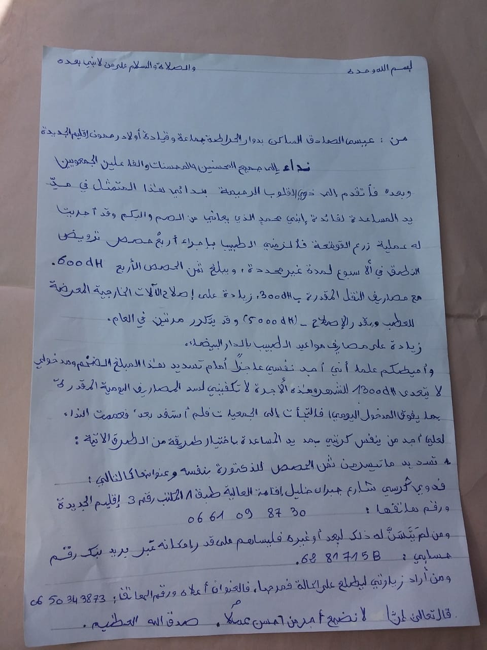 تجدون رفقة هدا النداء، ملفا كاملا يتعلق بجميع المعلومات الخاصة به وبابنه وأخصائية الترويض بمدينة الجديدة. فالمرجو لمن اراد مساعدته الاتصال به هاتفيا او زيارته ببيته او مقر عمله للوقوف والتعرف على احتياجاته، او ارسال مساعدات ماليه له عن طريق حسابه البنكي او اداء بعض الحصص لأخصائية الترويض وإشعاره بدلك، والله لا يضيع اجر المحسنين.