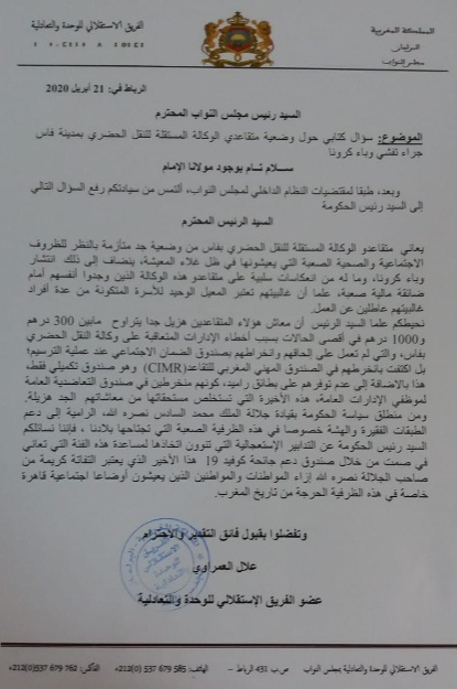 فيروس كورونا المستجد(كوفيد19)، وجه النائب علال العمراوي عن الفريق الاستقلالي للوحدة