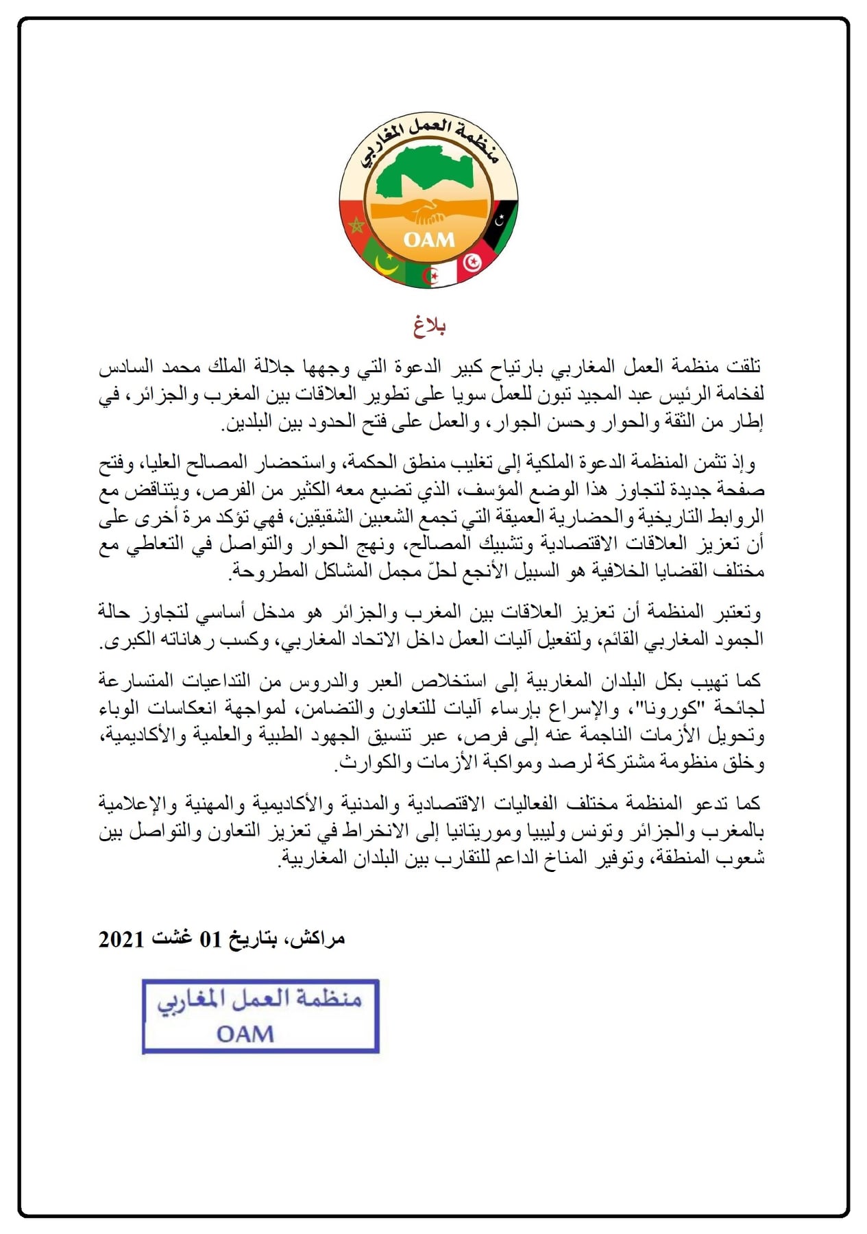 أصدرت منظمة العمل المغاربي بيانا، عبرت من خلاله عن ارتياحها الكبير، للدعوة التي وجهها جلالة الملك محمد السادس لفخامة الرئيس عبد المجيد تبون للعمل سويا على تطوير العلاقات بين المغرب والجزائر، في إطار من الثقة والحوار وحسن الجوار، والعمل على فتح الحدود بين البلدين.