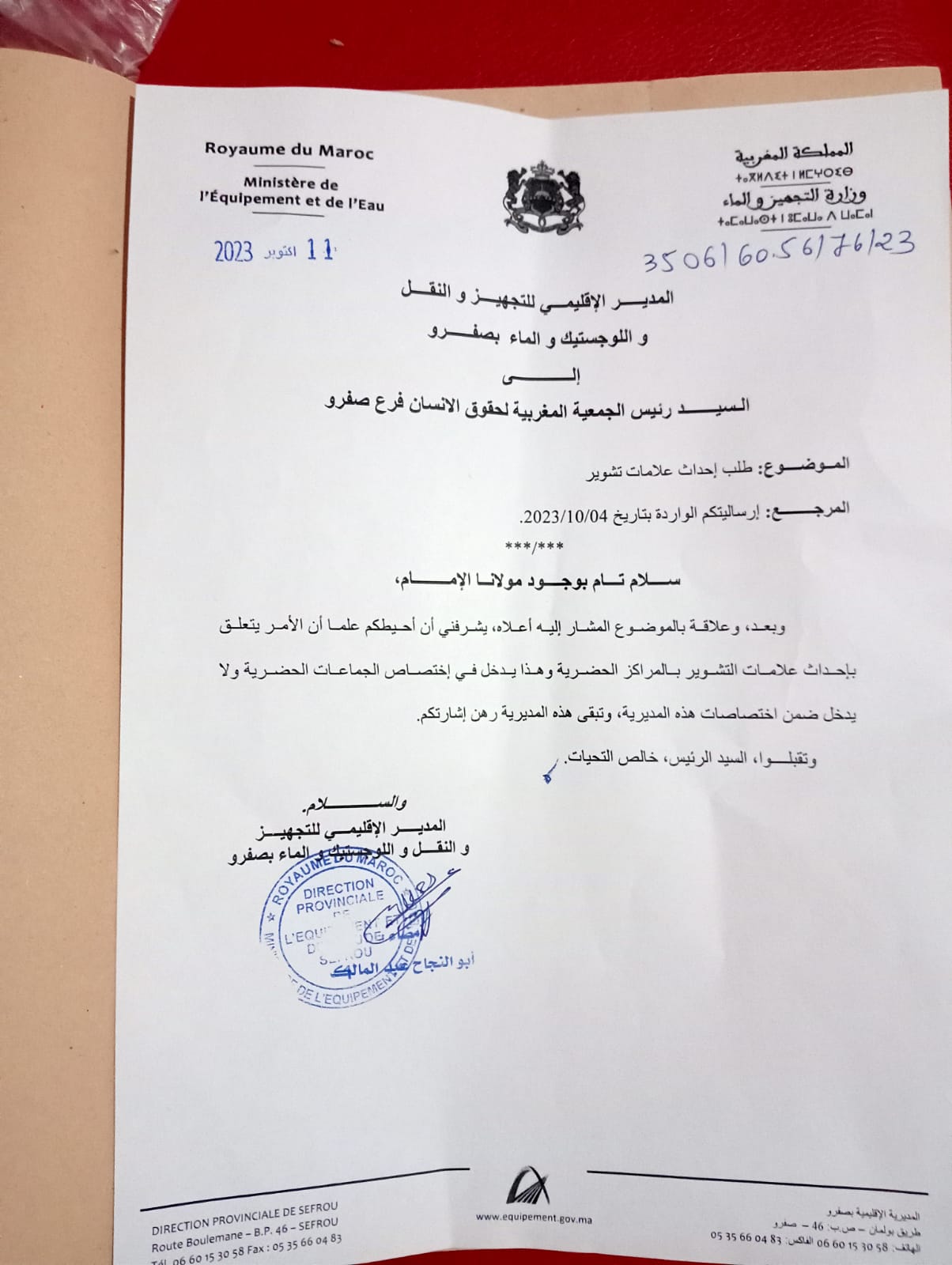 لوزارة التجهيز والنقل واللوجستيك بصفرو، والمدير الإقليمي لوزارة التربية الوطنية، منبها المديريتين إلى الاهتمام بأدوات